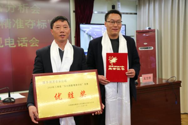会议表彰了获得“2018年三季度‘玉犬报捷 精准夺标’竞赛储蓄余额特殊贡献奖”的拉萨市分公司、获得“2018年三季度‘玉犬报捷 精准夺标’竞赛优胜奖”的林芝市分公司和获得“2018年三季度‘玉犬报捷 精准夺标’竞赛鼓励奖”的阿里地区分公司。吴登寿宣读了表彰决定,扎桑拉姆副总经理、袁军副总经理分别为主题营销竞赛活动的获奖单位颁奖。