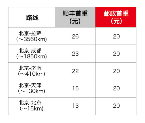 “同样是寄一张发票,寄到北京和寄到杭州竟然都是20元。但是其他快递公司都是距离越近价格越便宜。”江苏南京的淘宝店主毛腾飞说。EMS规定,不分寄递距离远近,邮件首重的价格全国统一为20元(见图1)。