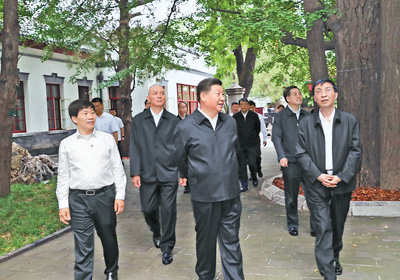 初秋的北京,气候宜人,喜庆祥和。12日下午,习近平从中南海乘车来到位于北京西郊香山公园内的香山革命纪念地视察。习近平首先来到双清别墅,瞻仰毛泽东同志当年办公居住的地方。修缮一新的双清别墅,保持了原有风貌,绿树成荫,格外幽静。别墅内,办公室、会客室、卧室、饭厅的家具陈设,床上的书籍和墙上的《中国解放区现势图》、《最新北平大地图》等的摆放,都一如原样。习近平仔细察看,不时询问历史细节,对别墅的维护、修缮和文物保护表示满意。
