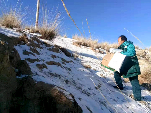 寒冬时节,海拔3800米的甘肃省甘南藏族自治州多地风雪交加,昔日人欢马嘶的甘南大草原盖上了一层厚厚的“棉被”,而玛曲县欧拉秀玛邮政所的南吉草正深一脚浅一脚,迎着风雪,艰难地行走在熟悉的邮路上……“都是乡亲们等着急用的包裹呢,不敢给人家耽误喽,坚持一会儿就送完了。”南吉草拍了拍肩上的邮包,憨厚一笑,深邃的目光看了看远方,继续前行。白雪覆盖的路面上,留下了一串串坚实的脚印。