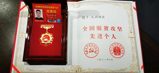 2月25日,全国脱贫攻坚总结表彰大会在北京人民大会堂隆重举行。大会上,中国邮政储蓄银行青海省分行班玛县支行行长、果洛州玛沁县下大武乡年扎村第一书记扎西闹吾荣获“全国脱贫攻坚先进个人”称号。