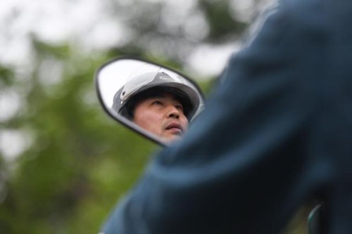 在安徽省巢湖市散兵镇山口村,郑爱军骑行在投递邮件的路上(4月30日摄)。