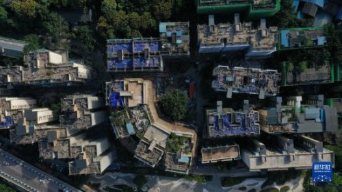 这是重庆市北碚区新房子片区老旧小区改造项目施工现场(2021年10月23日摄,无人机照片)。新华社发(秦廷富摄)