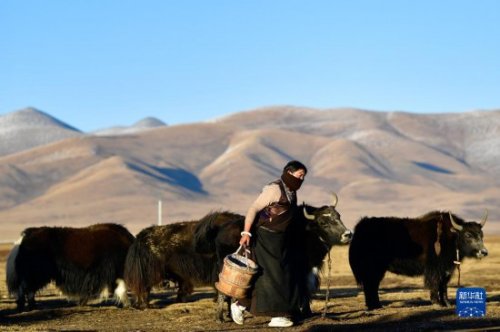 青海省玉树藏族自治州称多县珍秦镇二村牧民扎西德藏准备给牦牛挤奶(2020年10月28日摄)。新华社记者 张龙 摄