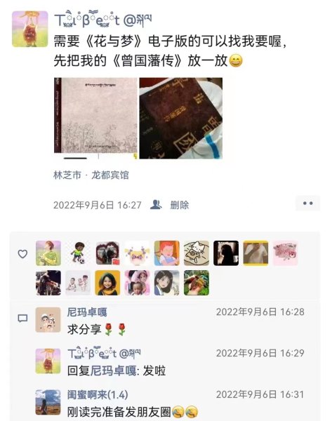 终于买到了藏文小说《花与梦》的电子版了,我觉得这个时候应该有很多人想要阅读这个小说而且有时间,所以我发了个朋友圈,免费分享给其他人,确实有好多人要耶,还有人给我分享了他们的好书。果然,书籍的魅力不言而喻,分享的快乐更是开心至极。