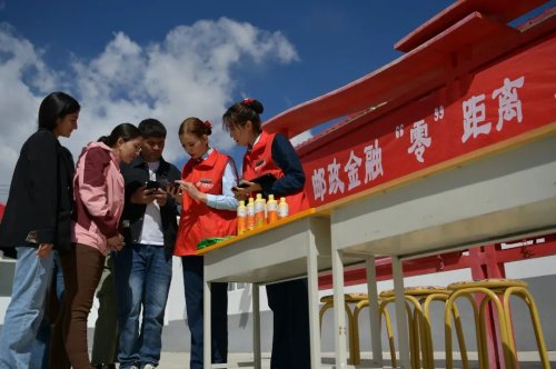村委会中心迎风招展的五星红旗下,绿色的邮车即将完成邮件交接,而鲜红的“邮政金融‘零’距离,乡村振兴‘邮’力量”横幅旁,办理业务的村民仍络绎不绝。