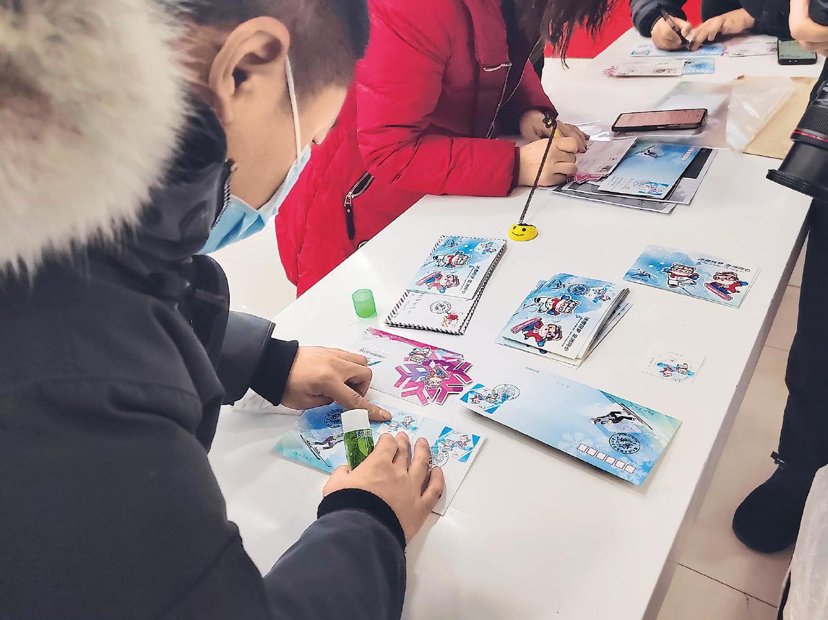 集邮爱好者在亚冬会纪念邮票首发现场自制首日封。 □张丹丹 摄