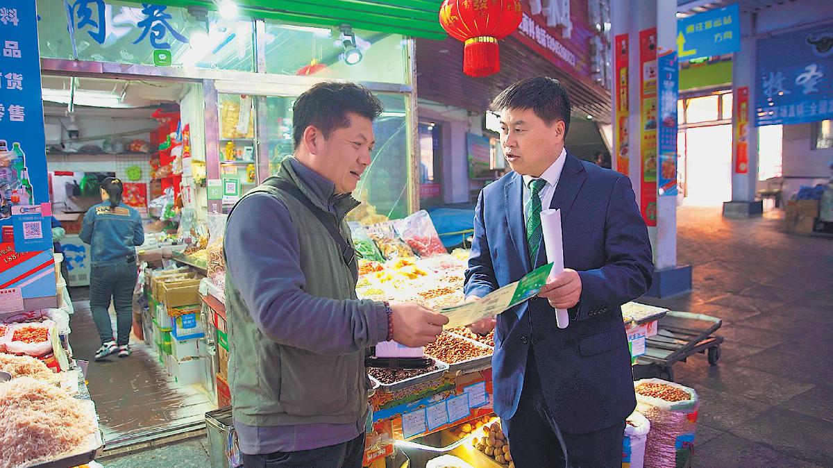 周庆水向网点周边商户宣传业务。
