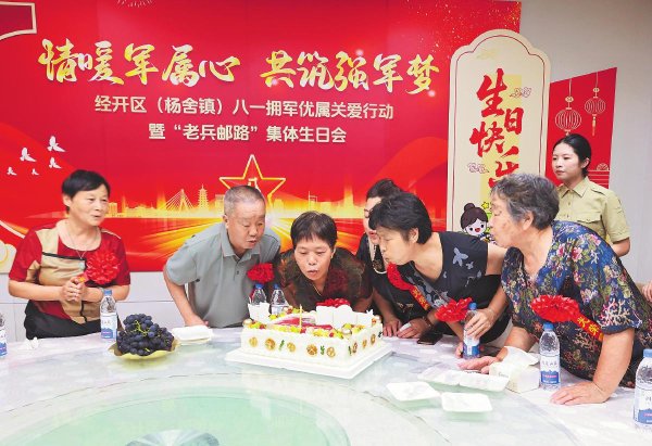 7月底,江苏省张家港市邮政分公司党委联合杨舍镇退役军人服务站举办了“情暖军属心 共筑强军梦”“八一”拥军优属关爱行动暨“老兵邮路”集体生日会。20余位军属代表欢聚一堂,共同度过了一个难忘的集体生日。“第一次过这么热闹的集体生日,孩子们在部队放心,我们在家乡被照顾得很好!”军属许阿姨眼眶湿润,满是感动。