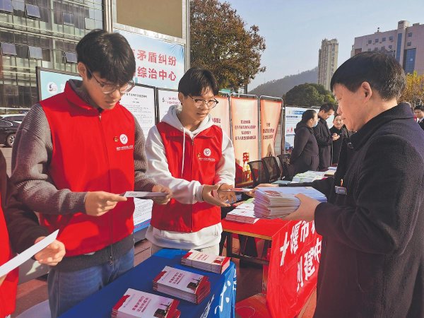 12月1日,2025年湖北省十堰市第八个“宪法宣传周”启动仪式暨集中法治宣传活动在该市人民广场举行。十堰市邮政分公司将法律法规宣传与邮政业务深度融合,通过发放邮资纪念封、加盖纪念戳、现场答疑解惑等方式,向来往群众普及法律法规知识,助力营造全社会尊法学法守法用法的良好氛围。图为邮政工作人员向现场志愿者发放纪念封。