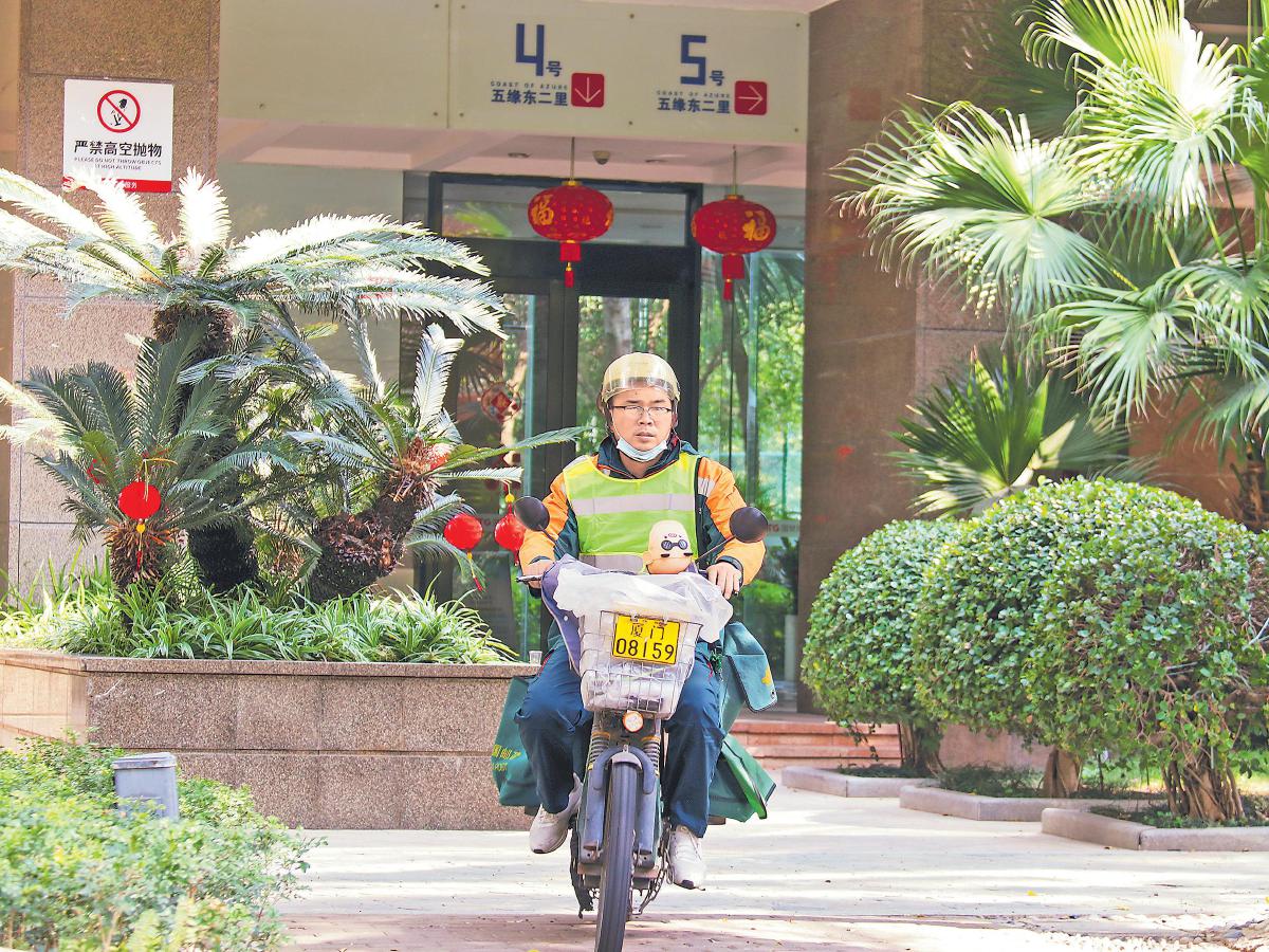 蔡加杰在小区内投递。
